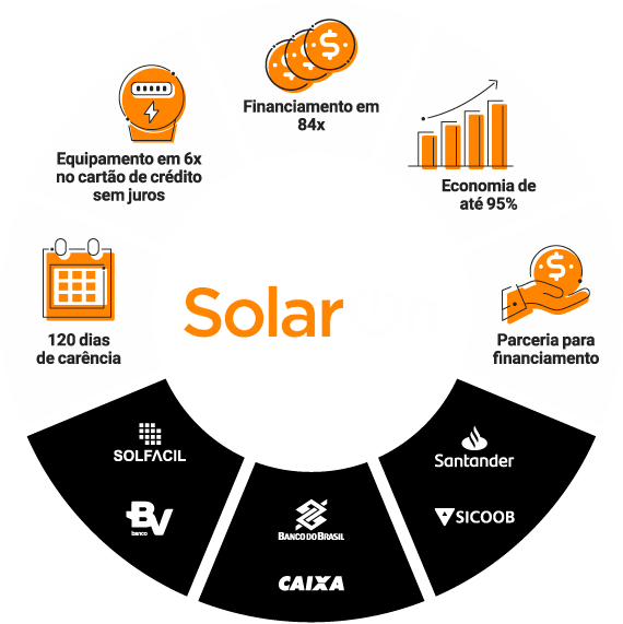 Na SolarOn possuímos diferentes formas de pagamento para que você possa escolher a que melhor cabe no seu bolso. O sistema pode ser pago em parcelas menores que a conta de luz, em até 84x e com 120 dias de carência.